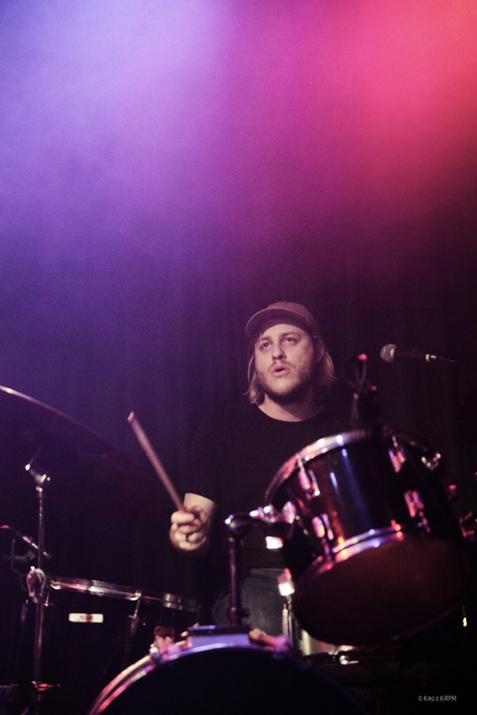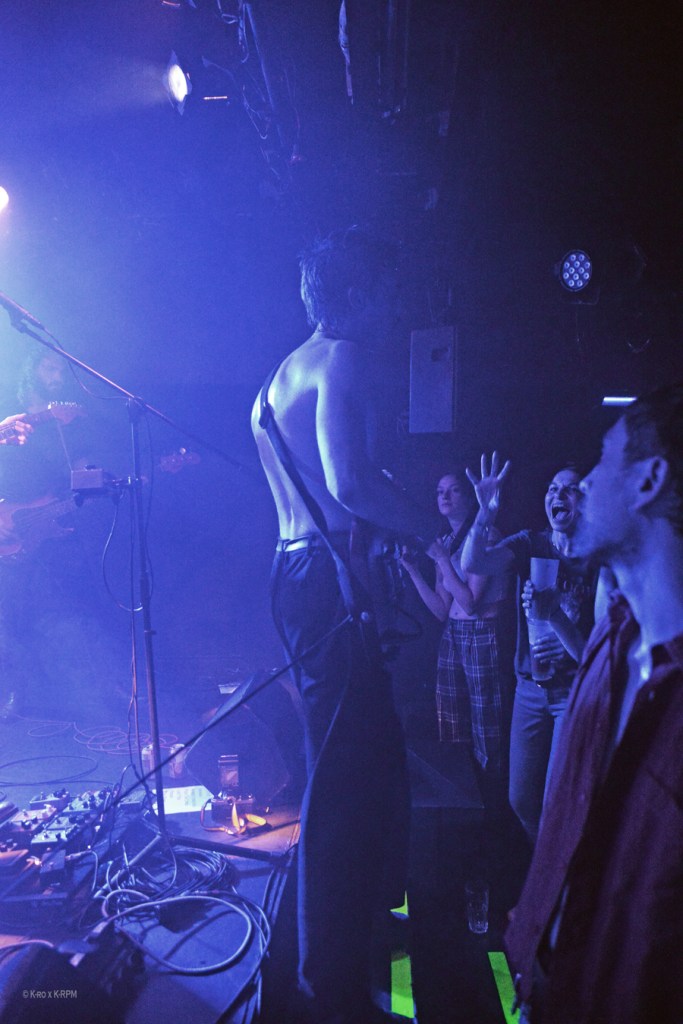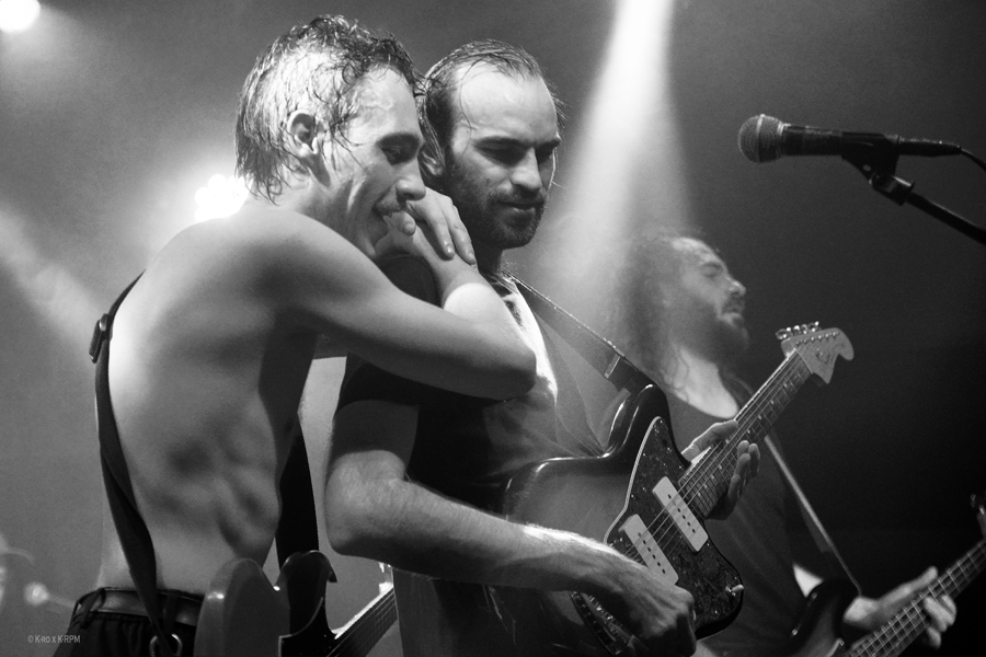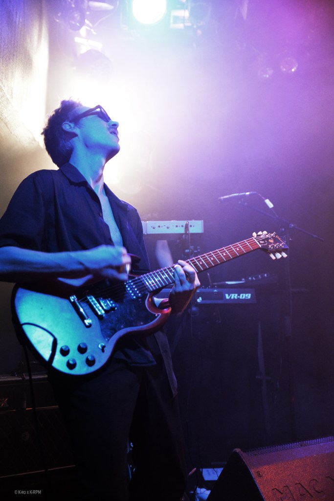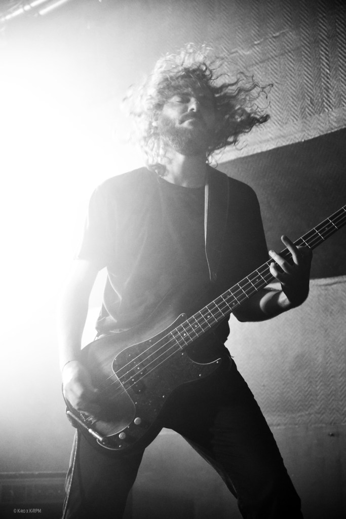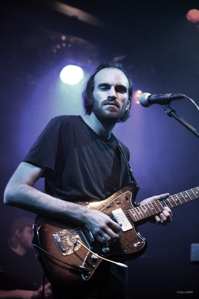Le chanteur Nico entre dans l’arène et s’assied nonchalamment en tailleur, devant son pedalboard, guitare en main. Quelques accords commencent à tinter, amplifiés par les effets de reverb. La scène est plongée dans le noir. Seuls quelques spots colorés viennent éclairer le chanteur. Les musiciens rejoignent tour à tour leur place. Chacun est sobrement vêtu de noir, on va à l’essentiel. On baigne dans une atmosphère sombre, presque mystique et résolument rock. Ces codes ne sont pas sans me rappeler le groupe anglais Famyne, maîtres du rock psyché, supplément heavy. La soirée s’annonce sous les meilleurs auspices.
