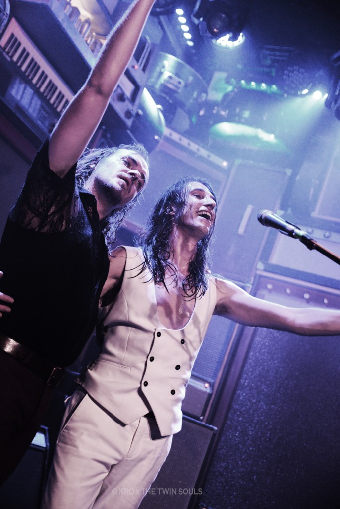 Scéniquement ils réussissent également le pari de ne pas lasser visuellement, ce qui pourrait être le risque avec un duo. Cette interchangeabilité des instruments y contribue bien sûr grandement, leur permettant une mobilité mais surtout une variabilité accrue de la voix au chant qui oscille de l’un à l’autre, frénétique, rauque.